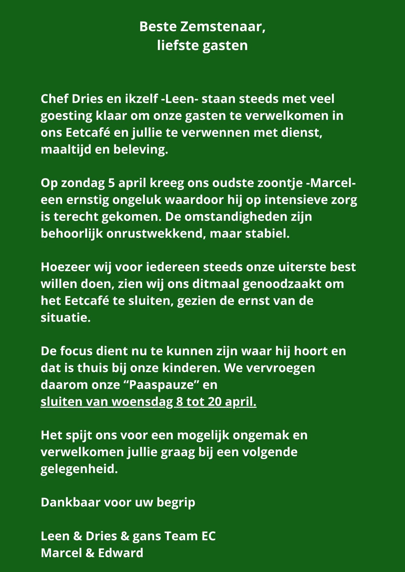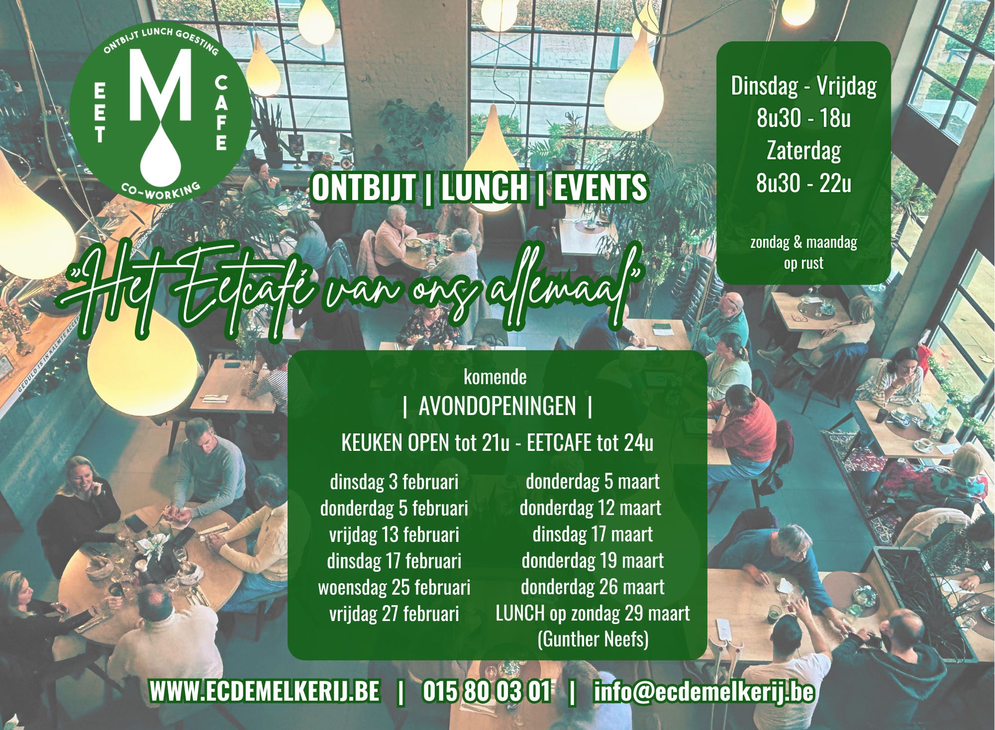 Iedereen is welkom om te komen eten, drinken en babbelen in de living. ’s Ochtends vroeg ontbijt, hartige brunch, zakenlunch, afternoon tea, afterwork,… Wij voorzien de juiste sfeer, en een gevarieerde menukaart.